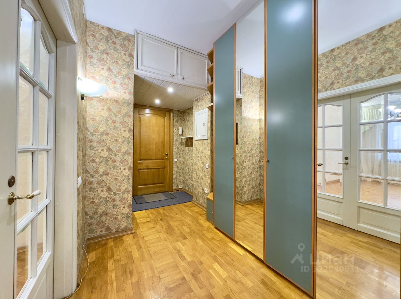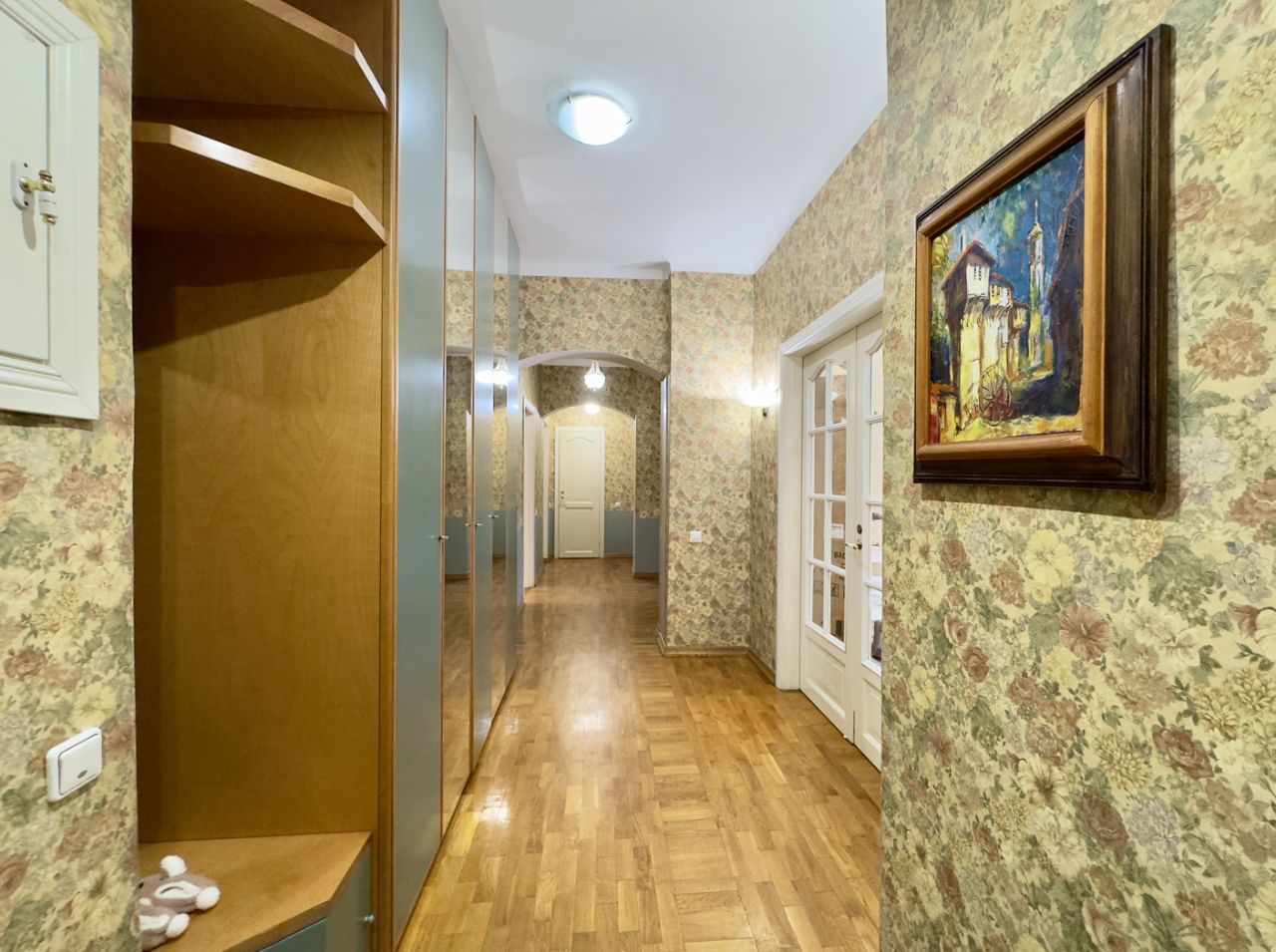 На полу - натуральный дубовый паркет. Плитка в ванных комнатах и на кухне. Высокие потолки.